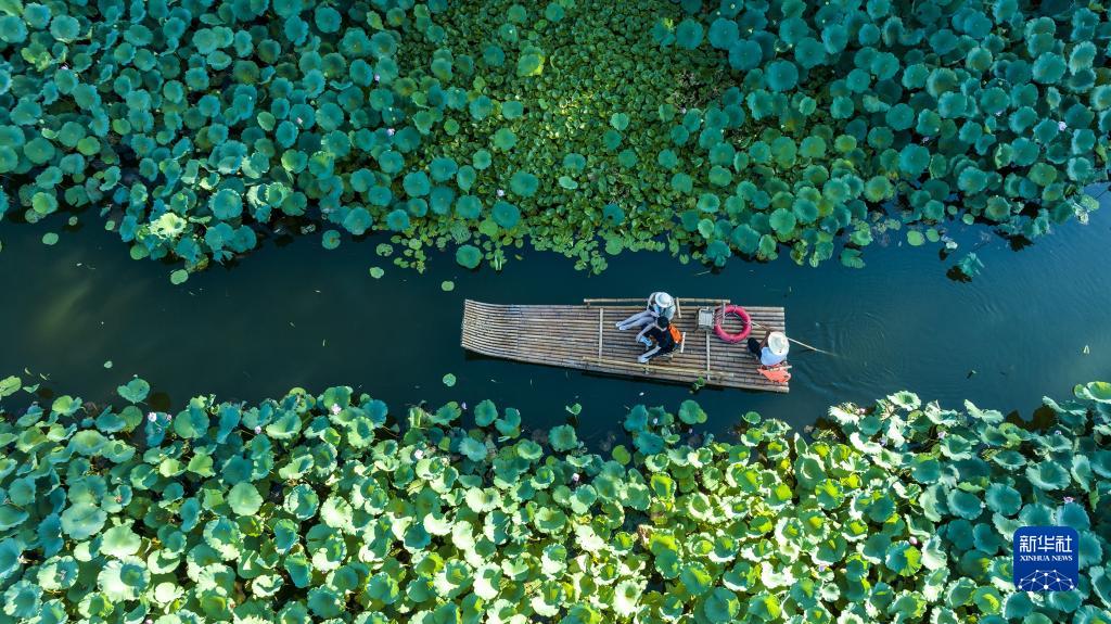 游客在黃山市徽州區呈坎古村乘竹筏游覽(8月4日攝,無(wú)人機照片)。