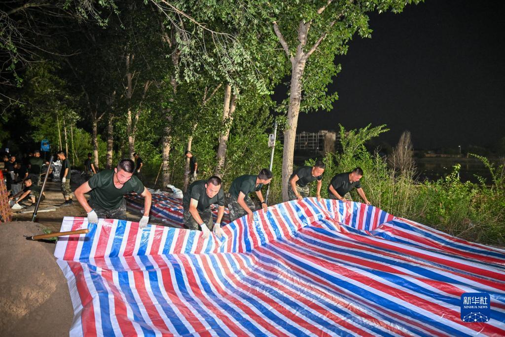 8月4日,武警天津總隊官兵在大清河天津靜海段南堤上進(jìn)行岸堤加固作業(yè)。
