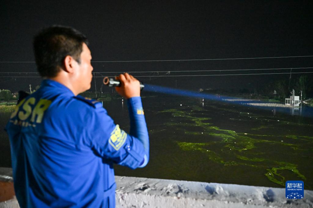 8月4日,天津靜海藍天救援隊隊員在天津市靜海區臺頭鎮革命橋上觀(guān)測橋下洪水情況。