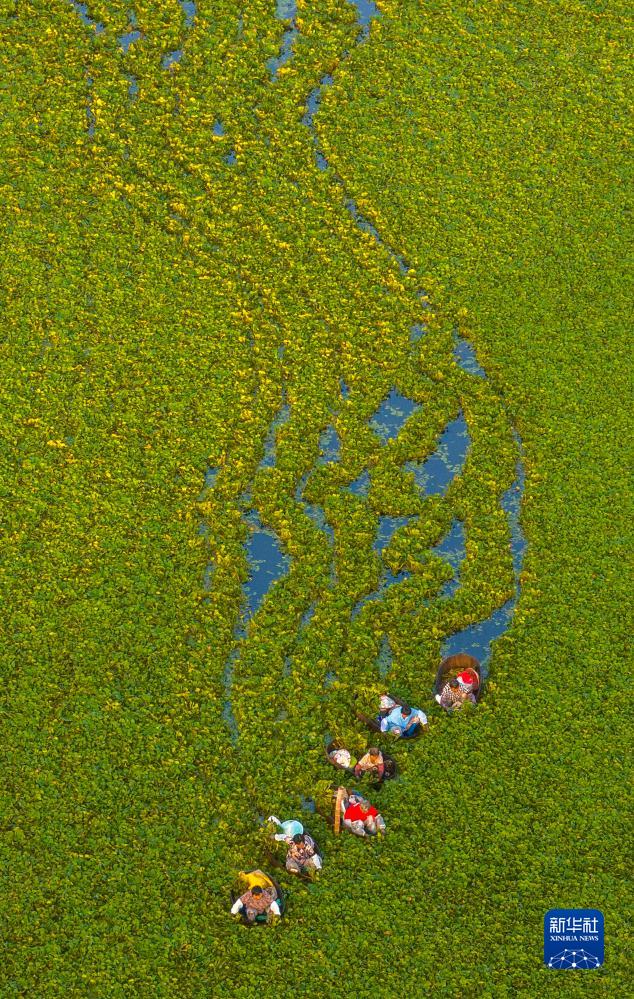 8月5日,江蘇省泰州市姜堰區溱潼鎮溱東村村民劃著(zhù)菱桶采摘菱角(無(wú)人機照片)。