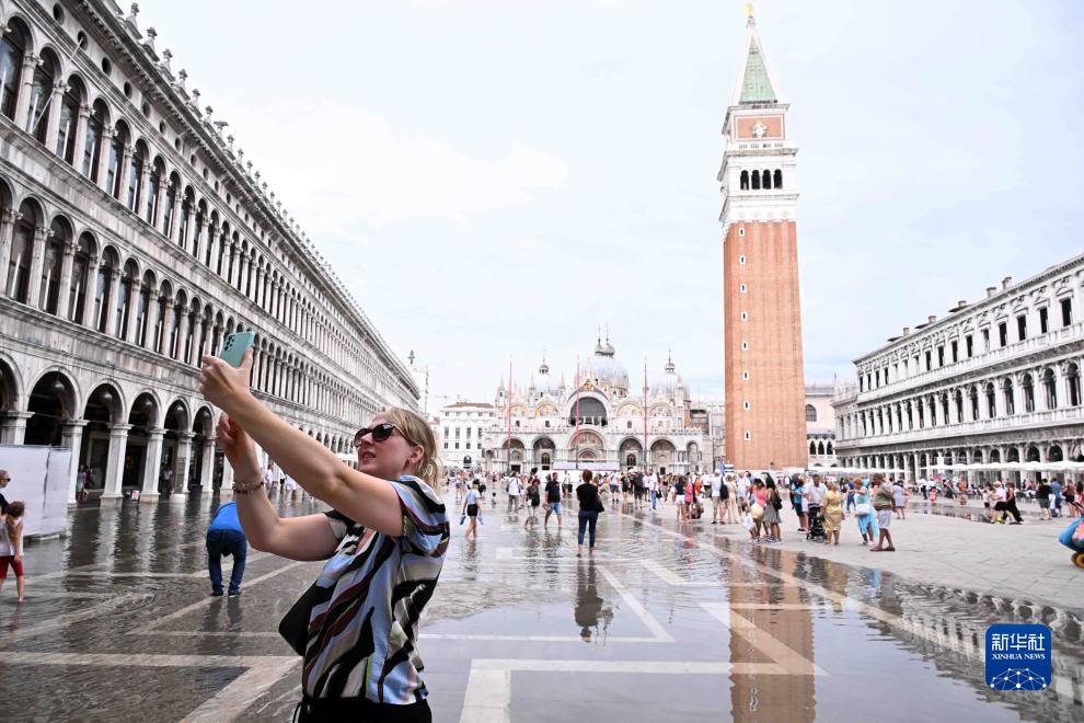 8月4日,一名游客在意大利威尼斯積水的圣馬可廣場(chǎng)自拍。