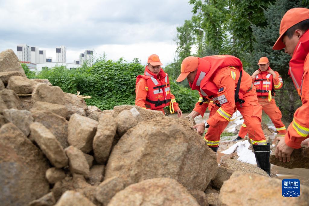 8月5日,在牡丹江市東安區大灣村附近,牡丹江市森林消防支隊的消防員搬運石頭封堵洪水。