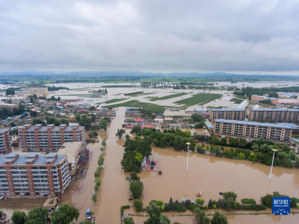 黑龍江省哈爾濱市延壽縣部分縣城被淹(8月5日攝,無(wú)人機照片)。