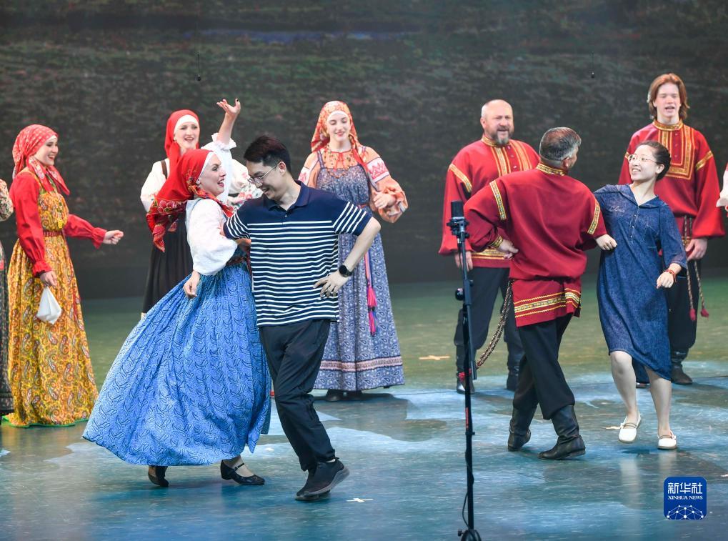在烏魯木齊晚報劇院,俄羅斯薩拉托夫州曙光歌舞團的演員們邀請現場(chǎng)觀(guān)眾同臺共舞(7月22日攝)。