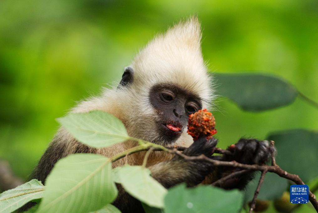 一只白頭葉猴在吃構樹(shù)的果實(shí)(8月4日攝)。
