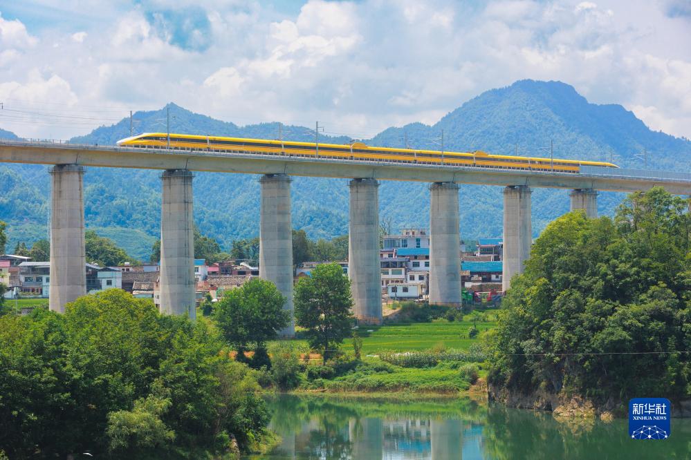 試驗動(dòng)車(chē)組經(jīng)過(guò)位于貴州省都勻市的貴南高鐵營(yíng)盤(pán)清水河雙線(xiàn)特大橋(8月4日攝)。