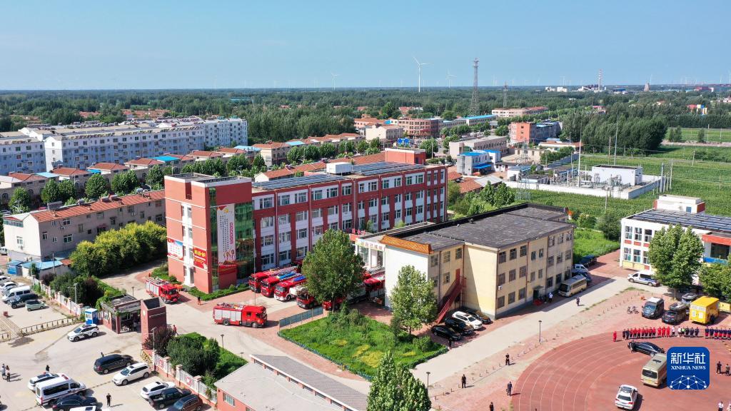 8月6日,在平原縣王打卦中心小學(xué),應急救援隊伍集結待命(無(wú)人機照片)。