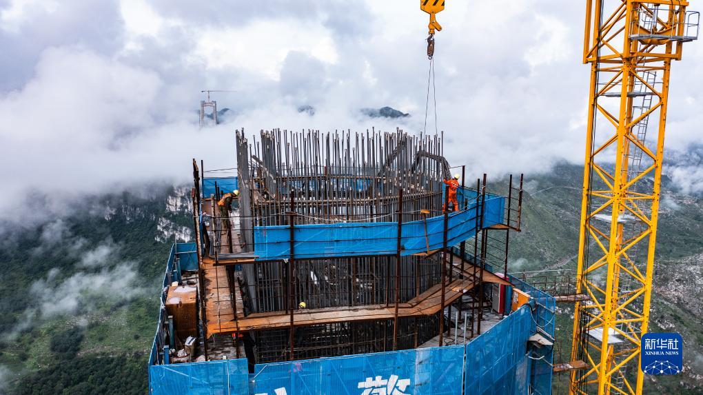 貴州公路集團工人在花江峽谷大橋5號主塔進(jìn)行施工(8月3日攝,無(wú)人機照片)。