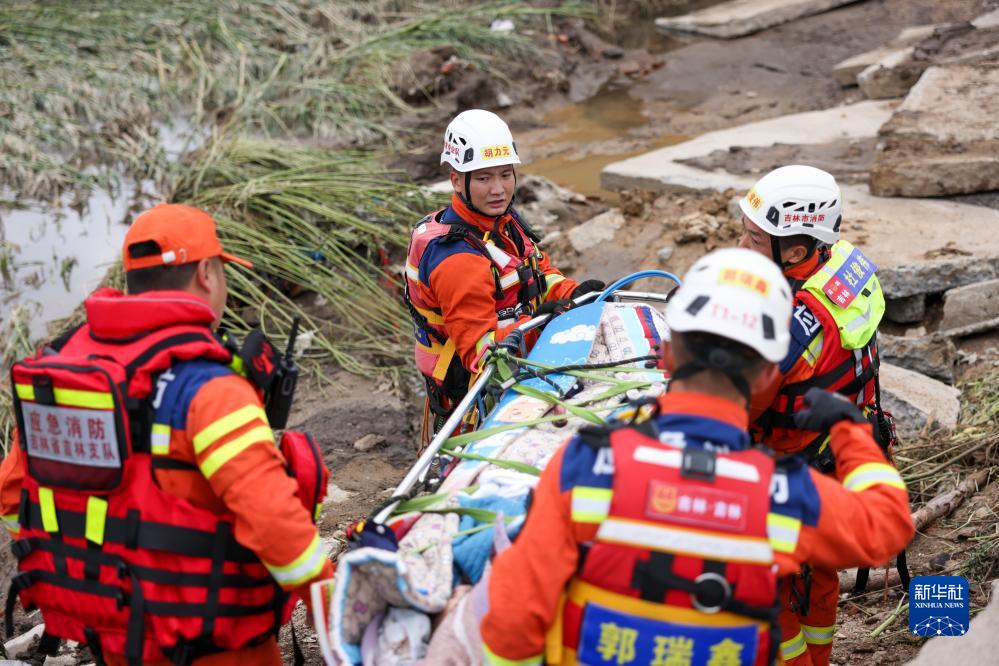 8月6日,吉林市消防救援支隊隊員用擔架抬著(zhù)曲鳳霞通過(guò)損毀路面。