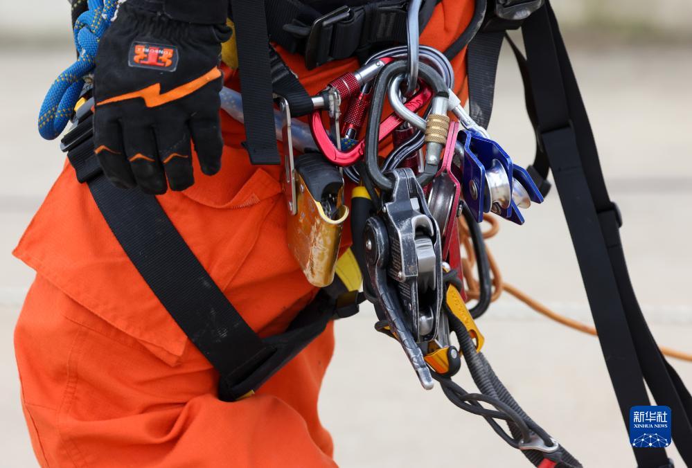 8月6日,吉林市消防救援支隊隊員整理身上的繩索工具。