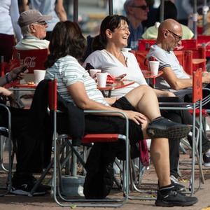 8月6日,人們在阿根廷首都布宜諾斯艾利斯的一處露天餐館用餐。