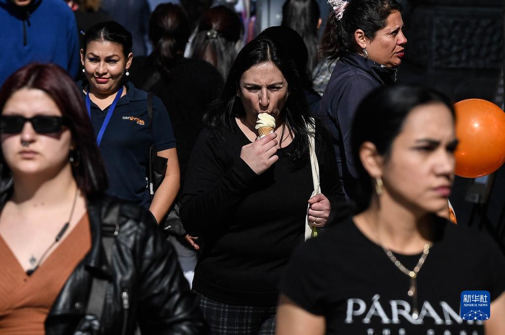 8月4日,行人在智利首都圣地亞哥街頭吃冰淇淋。