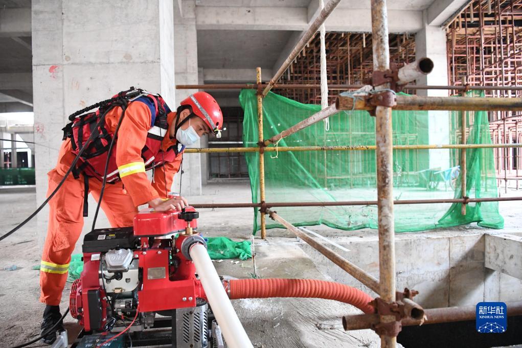 8月7日,邢臺市消防救援支隊隊員在河北省涿州市一處工地進(jìn)行排澇作業(yè)。