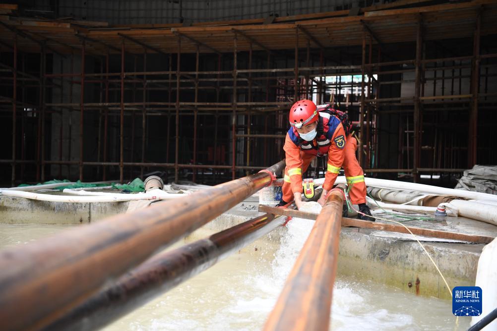 8月7日,邢臺市消防救援支隊隊員在河北省涿州市一處工地進(jìn)行排澇作業(yè)。
