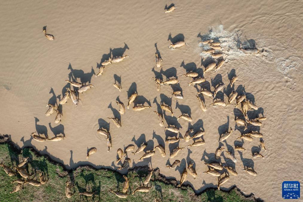 8月1日,在湖北石首麋鹿國家級自然保護區,一頭雄鹿在追逐雌鹿群(無(wú)人機照片)。