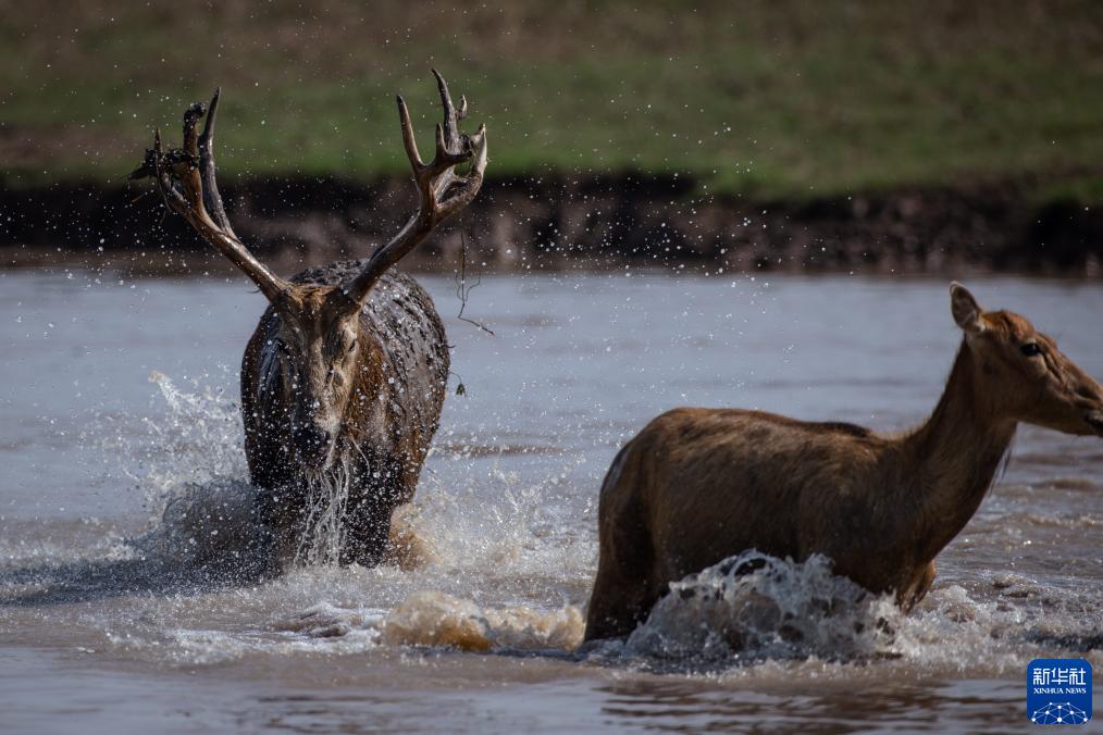 8月1日,在湖北石首麋鹿國家級自然保護區,一頭雄鹿在追逐雌鹿。