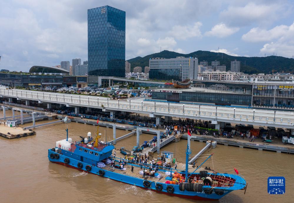 8月7日首批開(kāi)漁歸來(lái)的漁運船靠泊在舟山普陀沈家門(mén)舟山國際水產(chǎn)城碼頭,吸引了大批海鮮批發(fā)商前來(lái)選購新鮮的梭子蟹等漁獲(無(wú)人機照片)。