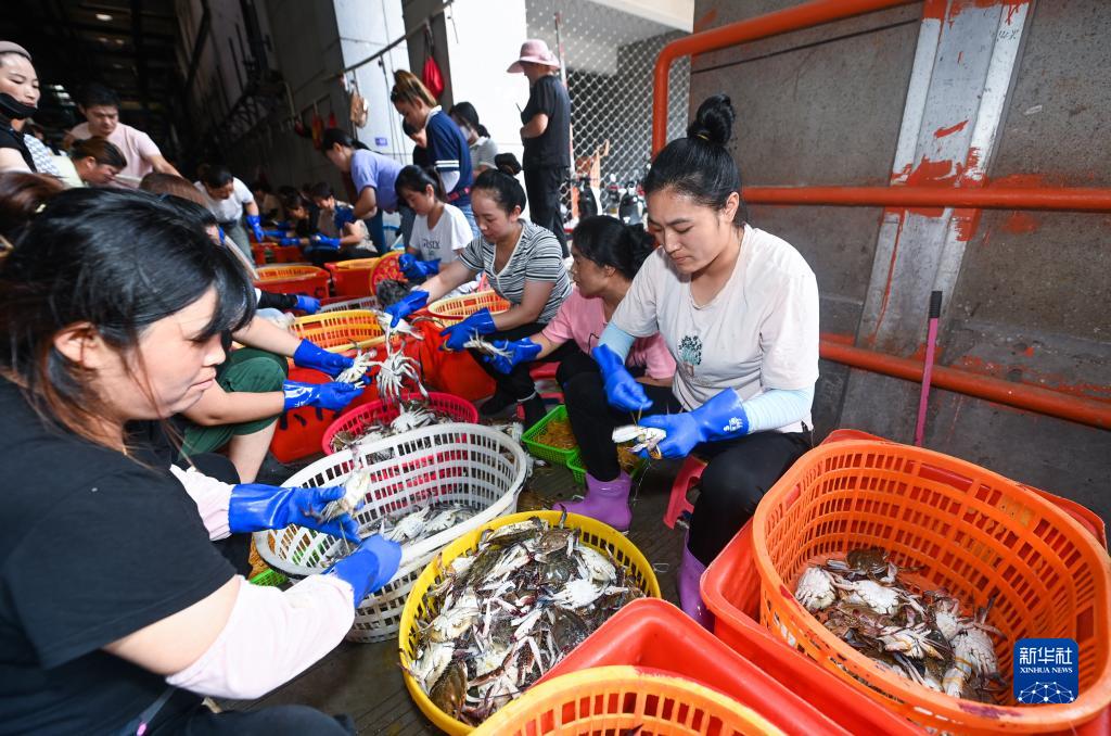 8月7日,舟山普陀沈家門(mén)舟山國際水產(chǎn)城的商戶(hù)們在分揀、綁扎開(kāi)漁捕撈上來(lái)的首批梭子蟹,然后發(fā)往各地市場(chǎng)。