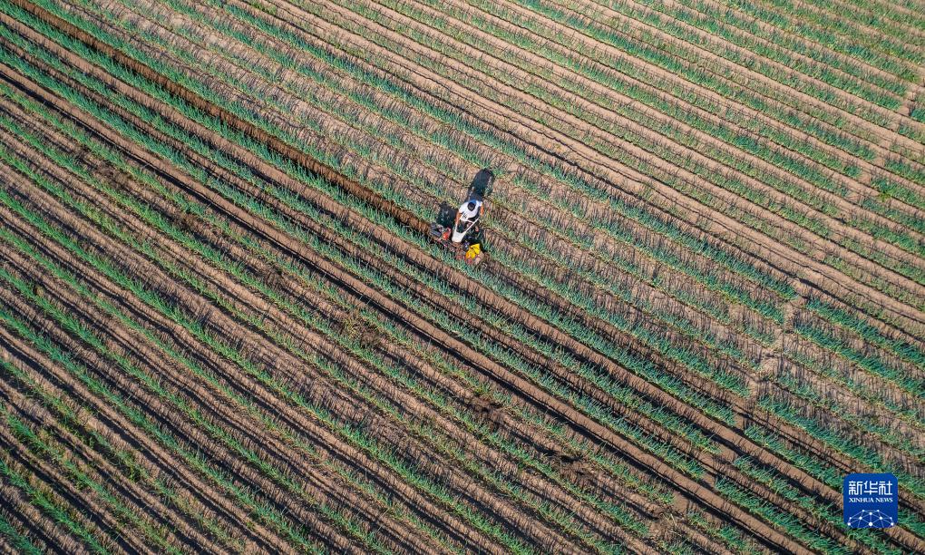 8月7日,河南省夏邑縣會(huì )亭鎮王廠(chǎng)村農民在給大蔥封溝(無(wú)人機照片)。