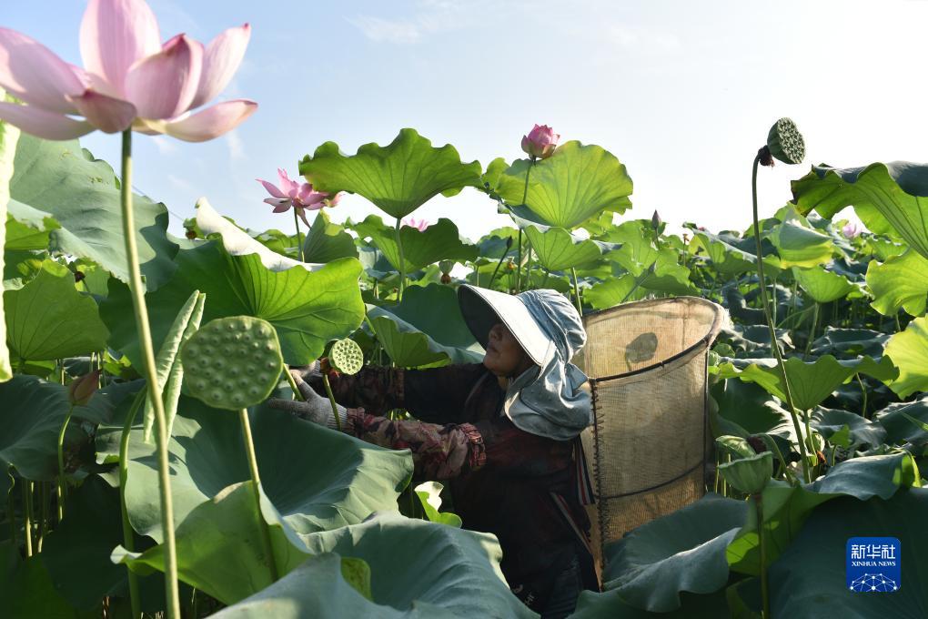 8月7日,在湖南省衡陽(yáng)市衡東縣高湖鎮新興垅村,村民在荷田中采摘蓮蓬。