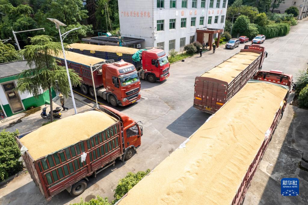 8月7日,運糧車(chē)在湖南安仁國家糧食儲備庫排隊過(guò)磅(無(wú)人機照片)。
