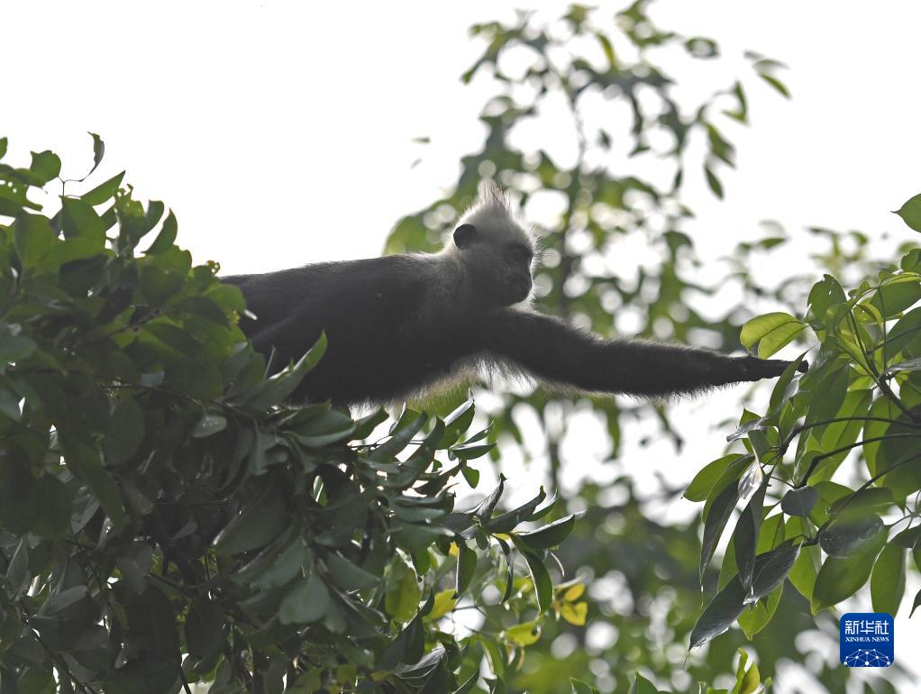 一只白頭葉猴在樹(shù)林里覓食(8月5日攝)。