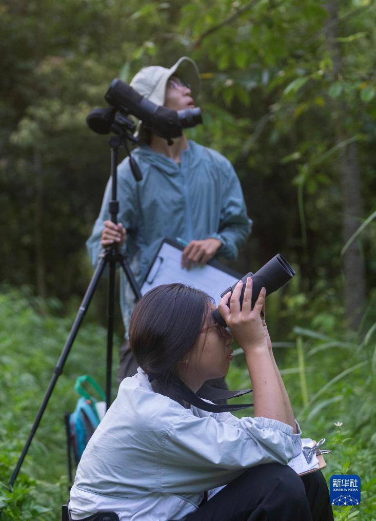 8月5日,李文欽(后)和劉彥辰在觀(guān)察猴群。