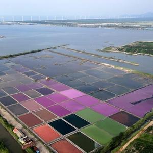 立秋將近,山東省榮成市港西鎮海邊的鹽田在晴空的映襯下呈現出五顏六色的美麗景象。