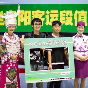 8月8日,旅客在貴陽(yáng)北站和身著(zhù)民族服裝的乘務(wù)員合影留念。