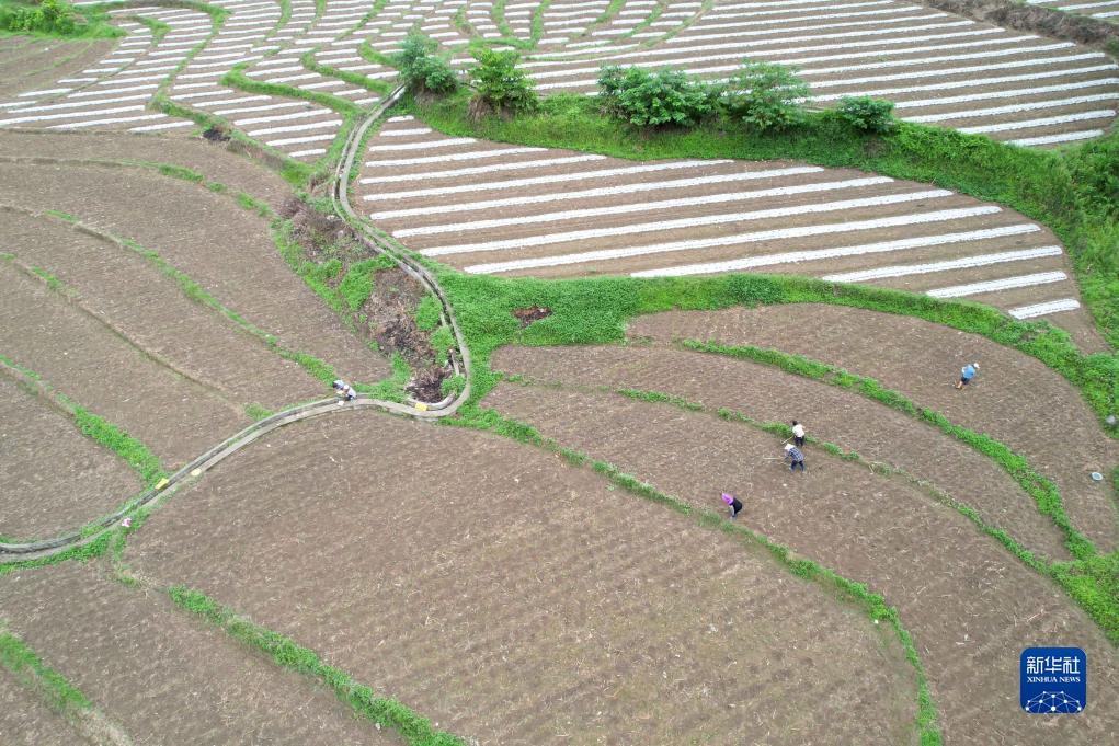 8月8日,村民在貴州省黔南布依族苗族自治州羅甸縣逢亭鎮床井村的田間勞作(無(wú)人機照片)。