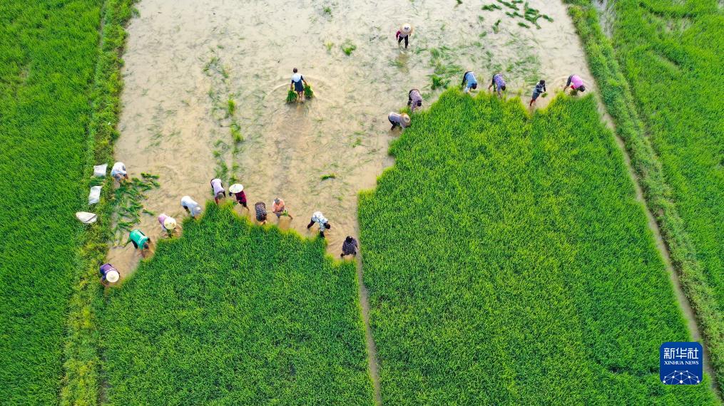 8月8日,在湖南省常寧市板橋鎮樟塘村,農民在起晚稻秧苗(無(wú)人機照片)。