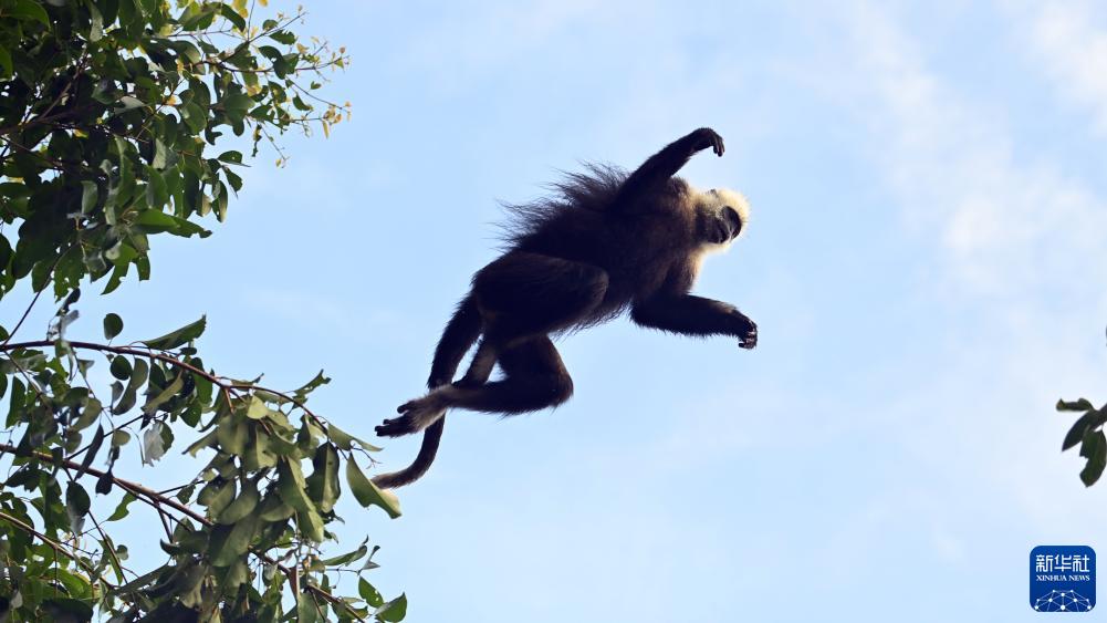 在崇左市江州區羅白鄉的白頭葉猴國家級自然保護區,白頭葉猴在林間飛躍(8月5日攝)。