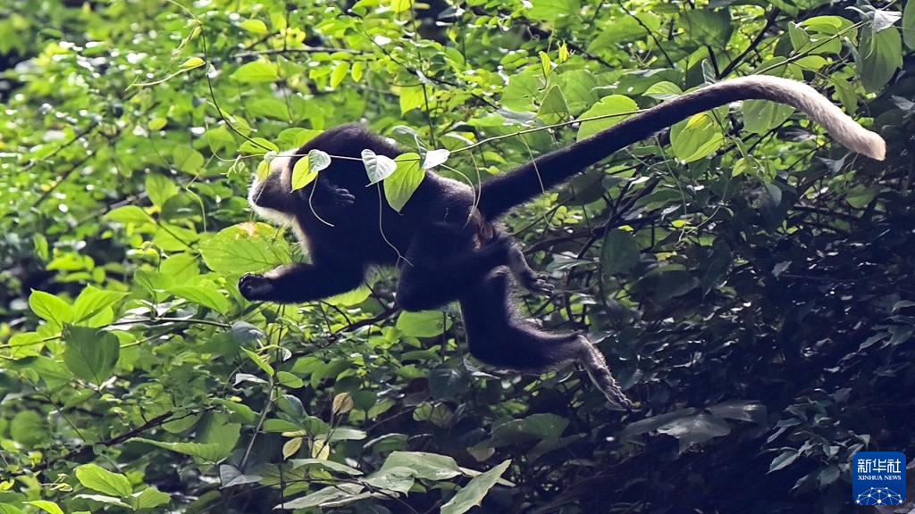 在崇左市江州區羅白鄉的白頭葉猴國家級自然保護區,白頭葉猴在林間飛躍(8月5日攝)。