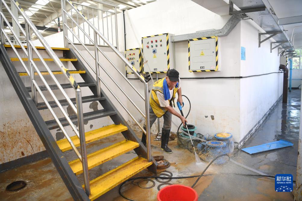8月8日,工作人員在涿州市城區地表水廠(chǎng)沖刷淤泥。