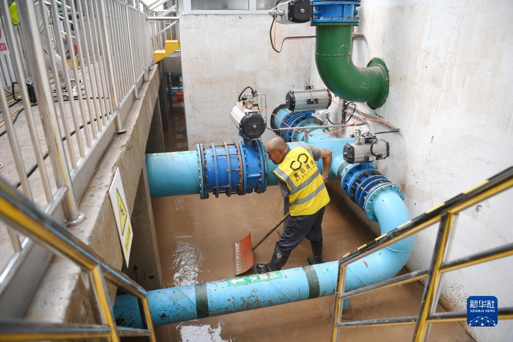 8月8日,工作人員在涿州市城區地表水廠(chǎng)設備間清理淤泥。