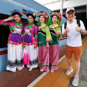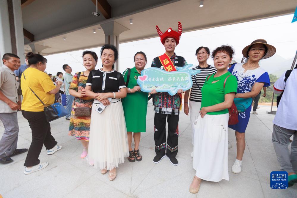 8月8日,旅客在荔波站內和身著(zhù)民族特色服裝的工作人員合影。