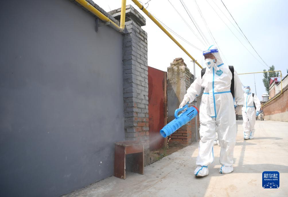 8月8日,工作人員在涿州市桃園街道忠義店村開(kāi)展防疫消殺作業(yè)。