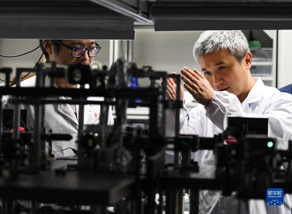 7月21日,在位于安徽合肥的中國科學(xué)技術(shù)大學(xué),彭承志在實(shí)驗室與學(xué)生交流實(shí)驗進(jìn)展。