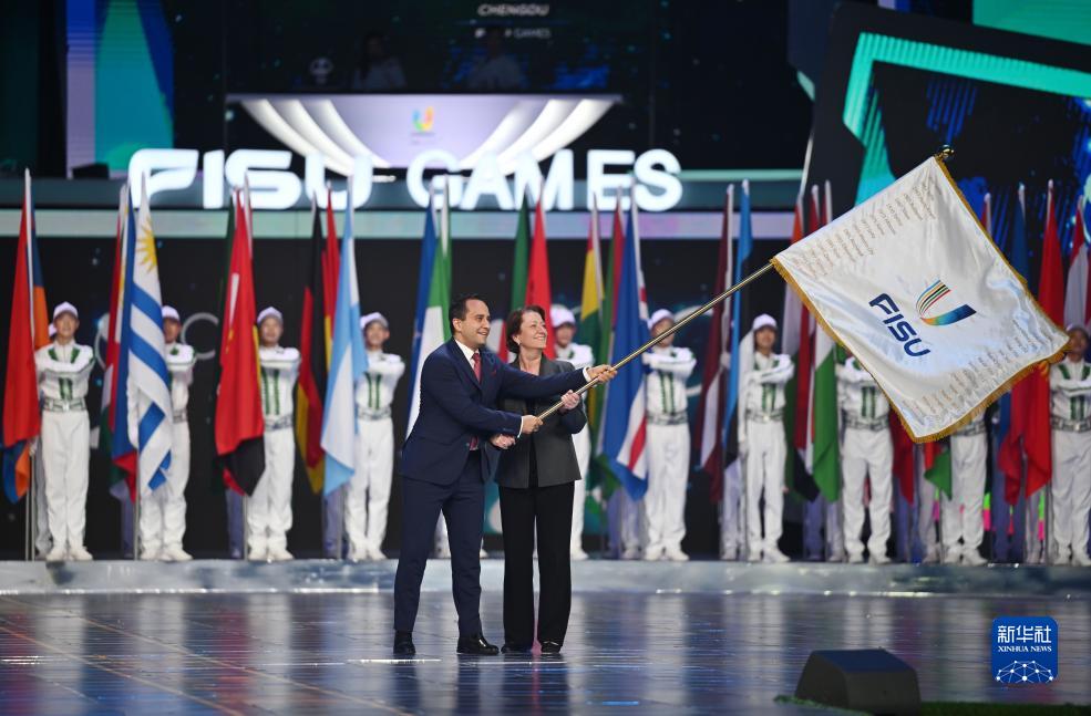 8月8日,下一屆大運會(huì )主辦城市代表、德國聯(lián)邦內政和國土部議會(huì )國務(wù)秘書(shū)馬哈茂德·厄茲德米爾(左)和國際大體聯(lián)首席執委維麗娜·伯克在會(huì )旗交接儀式上。