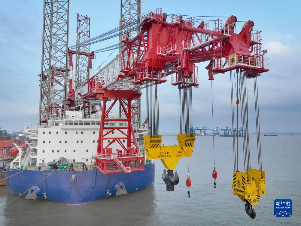 8月8日在振華南通重裝碼頭拍攝的中交海峰2500噸自升自航式風(fēng)電安裝平臺“海峰1001”(無(wú)人機照片)。新華社發(fā)(許叢軍 攝)