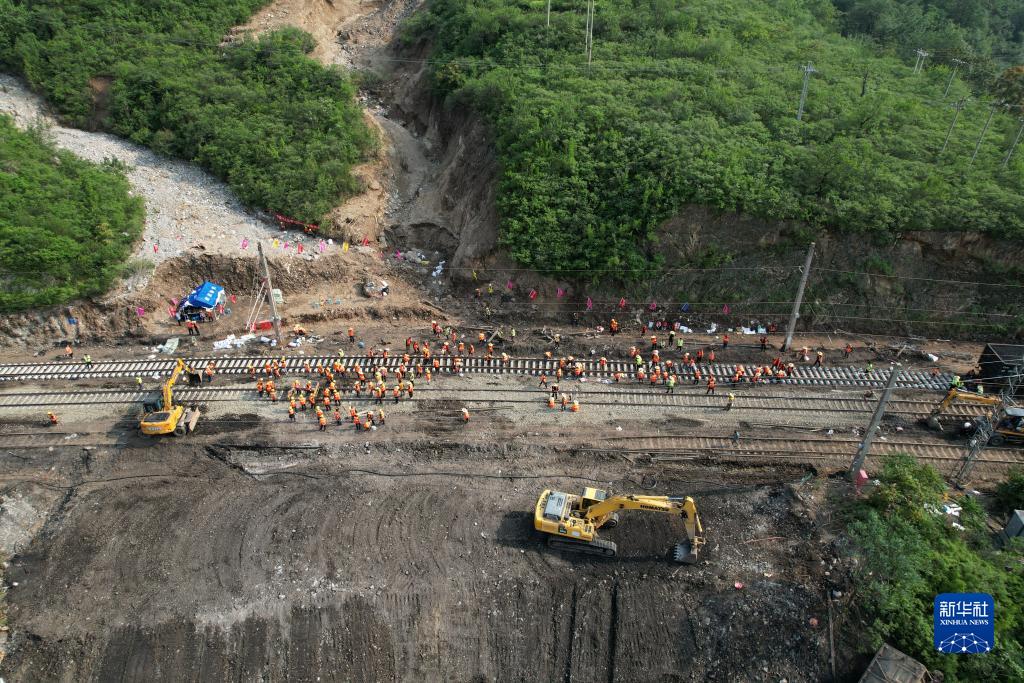 這是8月8日拍攝的豐沙線(xiàn)搶修現場(chǎng)(無(wú)人機照片)。