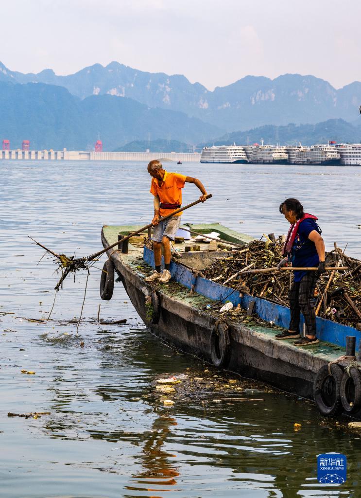 長(cháng)江進(jìn)入主汛期以來(lái),秸桿、樹(shù)枝、塑料等漂浮物隨波逐流,聚集到三峽庫區的江面上。三峽大壩上游的湖北省宜昌市秭歸縣環(huán)保部門(mén)組織清漂工人全力清漂,以減輕漂浮物對三峽樞紐運行的影響,確保三峽水庫水質(zhì)不受污染,保障船舶航行安全。