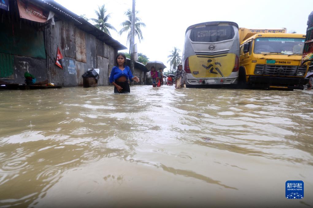 8月8日,在孟加拉國吉大港,人們走在充滿(mǎn)積水的道路上。