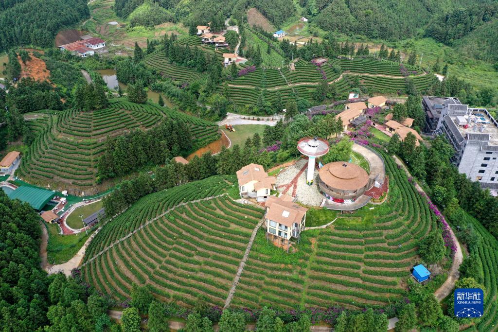 這是融水苗族自治縣融水鎮新安村水融香茶園茶葉種植基地(無(wú)人機照片,8月9日攝)。民宿、花廊、茶文化體驗館等文旅設施位于茶山上。