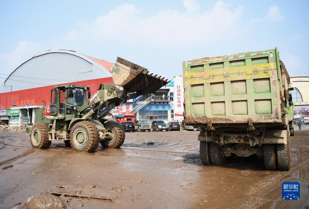 8月9日,車(chē)輛在涿州新發(fā)地大石橋農副產(chǎn)品批發(fā)市場(chǎng)清理淤泥。