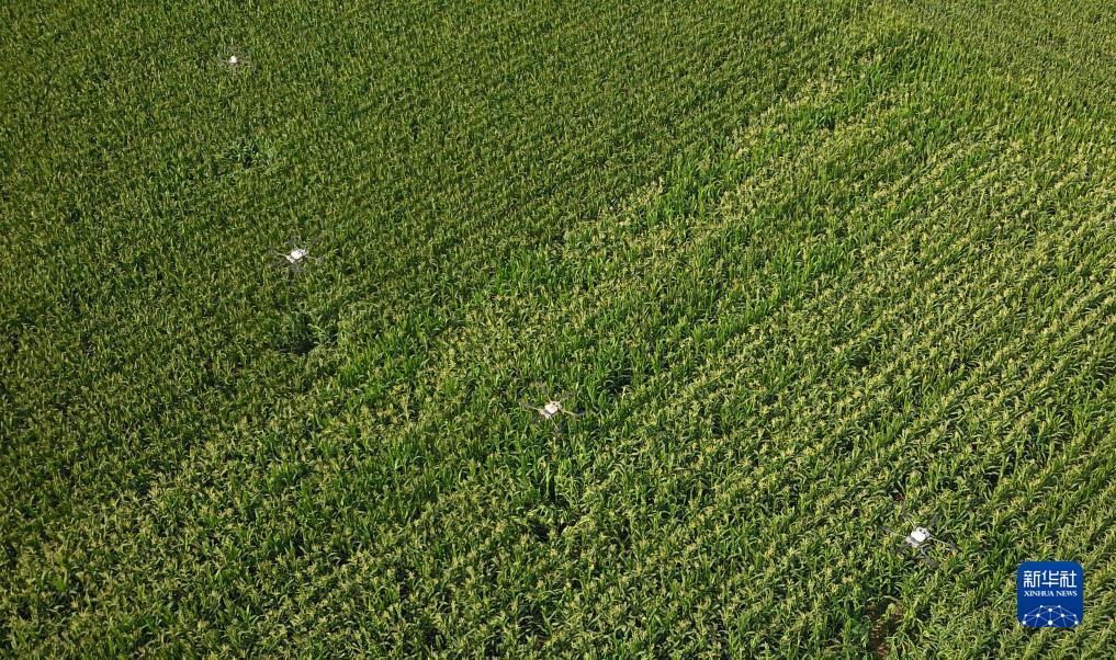 8月9日,在山東省成武縣孫寺鎮,農用植保無(wú)人機在玉米種植田上空進(jìn)行飛防作業(yè)(無(wú)人機照片)。