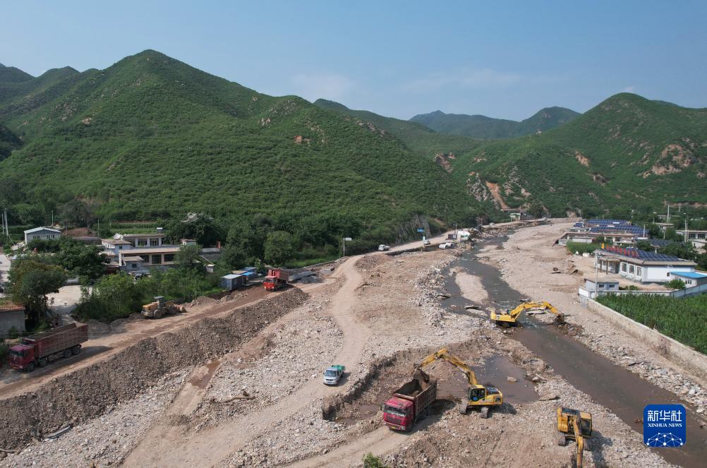 8月9日,工人操作機械設備搶修通往淶水縣九龍鎮山南村的道路(無(wú)人機照片)。