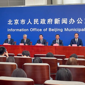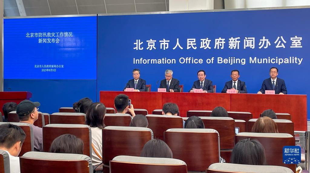 8月9日拍攝的北京市防汛救災工作情況新聞發(fā)布會(huì )現場(chǎng)。