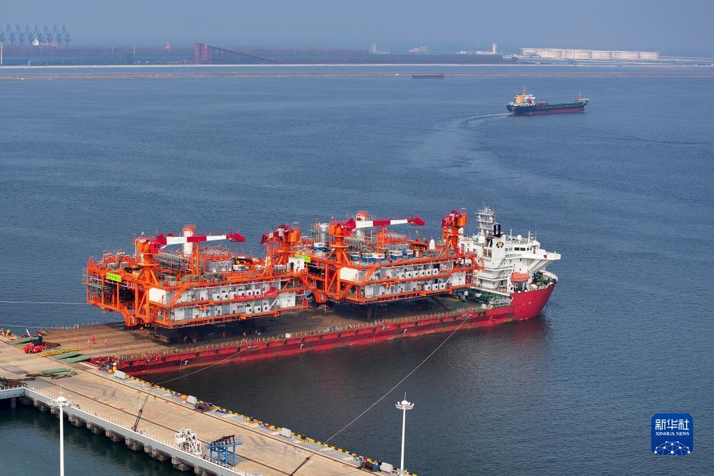 這是8月9日在天津濱海新區拍攝的渤中19-6凝析氣田I期開(kāi)發(fā)項目組塊裝船作業(yè)現場(chǎng)(無(wú)人機照片)。組塊裝船后將赴渤海西部海域,進(jìn)入海上安裝和聯(lián)調階段。