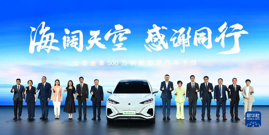 8月9日,嘉賓共同見(jiàn)證比亞迪第500萬(wàn)輛新能源汽車(chē)下線(xiàn)。新華社記者 梁旭 攝